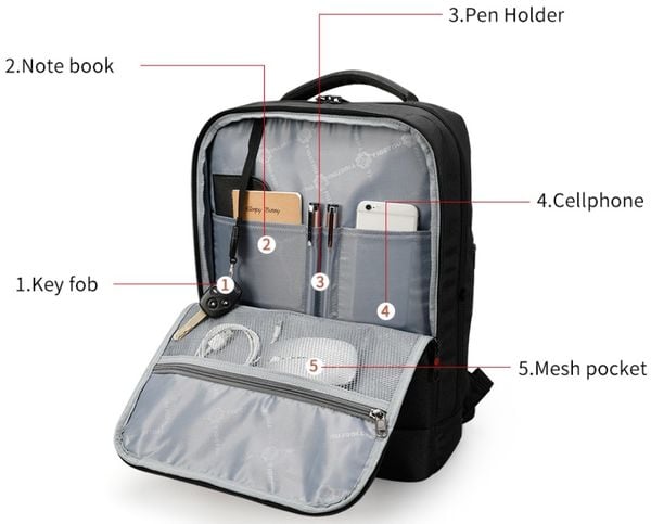 Các tính năng: đựng laptop/ iPad, giấy tờ...., chống thấm nước, Kết nối USB với sạc ĐT/iPad